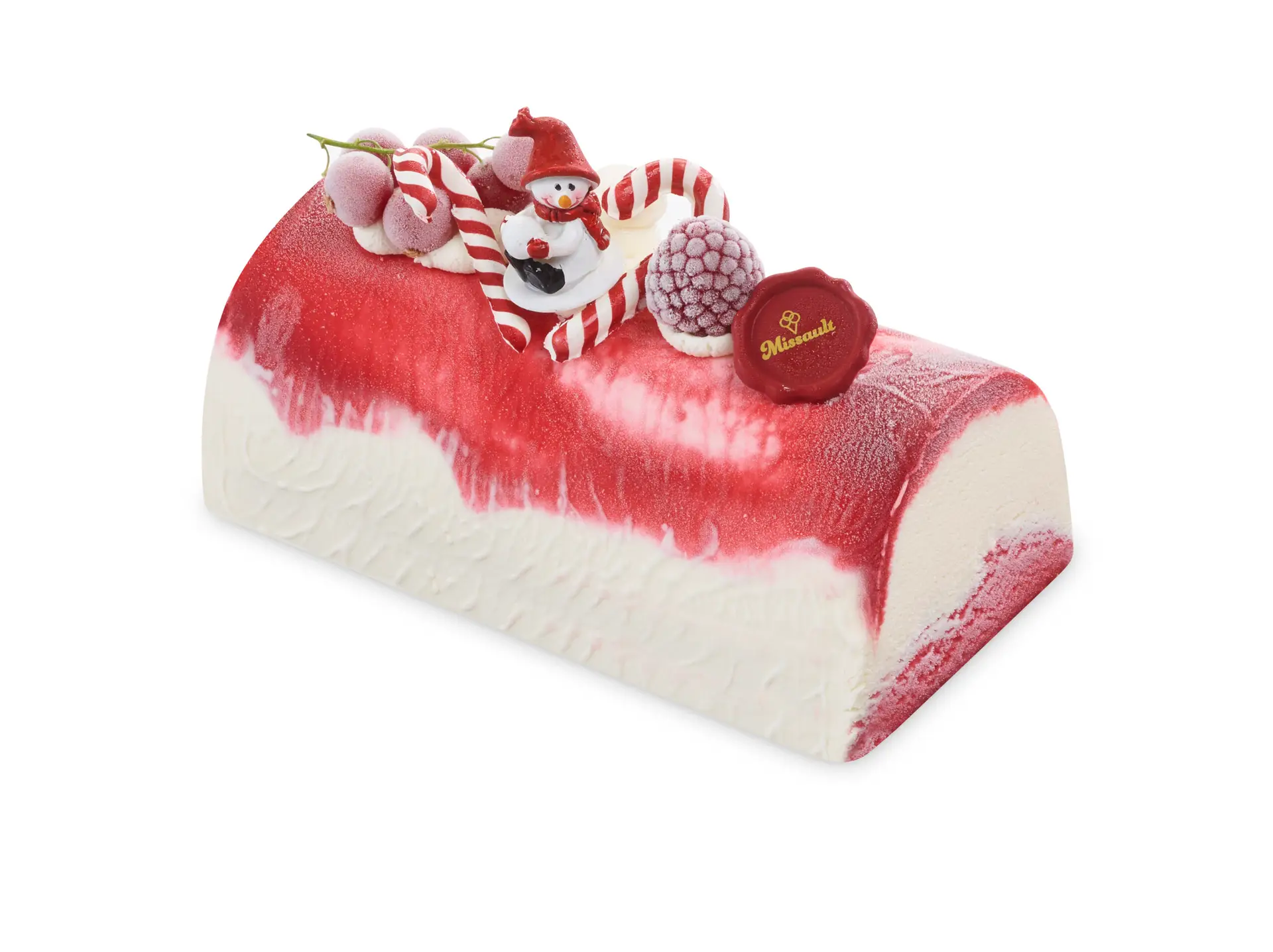 Feestelijke ijstaart van Missault met vanille roomijs en sorbet framboos, afgewerkt met frambozencoulis. Versierd met kerstdecoraties.